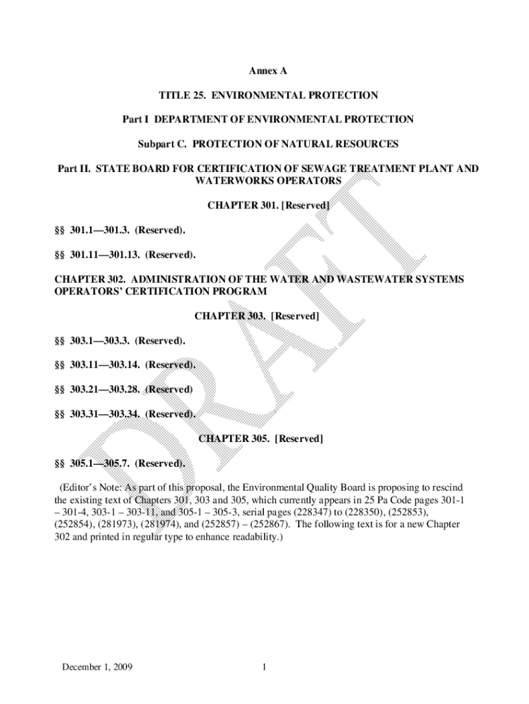 Annex A TITLE 25. ENVIRONMENTAL PROTECTION Part I DEPARTMENT OF ENVIRONMENTAL PROTECTION Subpart C. PROTECTION OF NATURAL RESOURCES Part II. STATE BOARD FOR CERTIFICATION OF SEWAGE TREATMENT PLANT