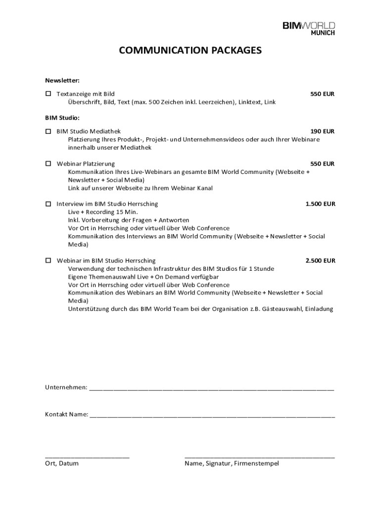 Get the free COMMUNICATION PACKAGES - BIM World MUNICH