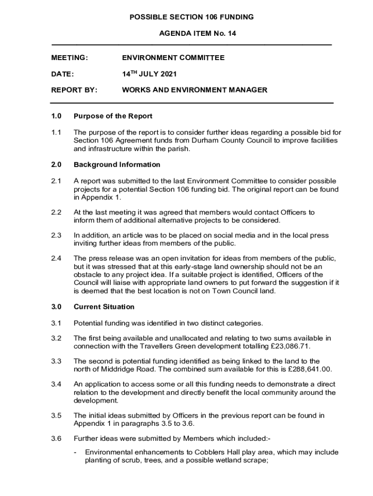 POSSIBLE SECTION 106 FUNDING AGENDA ITEM No. 14 ___ MEETING:ENVIRONMENT COMMITTEEMAN:14TH JULY 2021REPORT BY:WORKS AND ENVIRONMENT MANAGER1.0Purpose of the Report1.1The purpose of the report is to