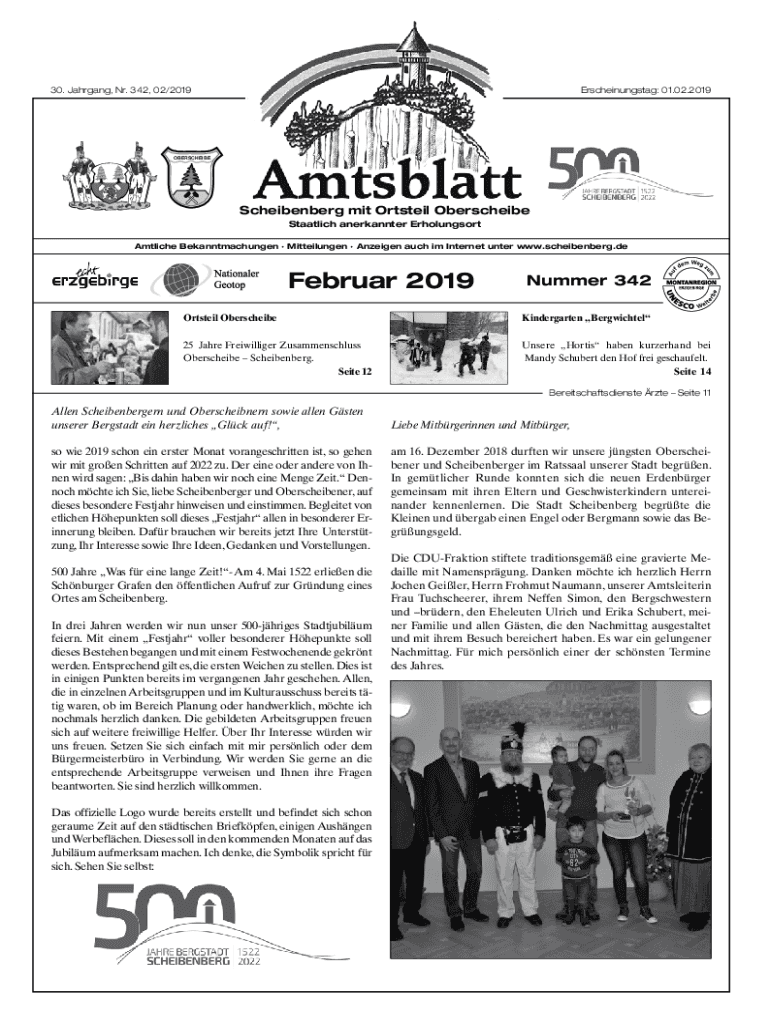 Erscheinungstag: 01.02.201930. Charging, NR. 342, 02/2019OBERSCHEIBEScheibenberg MIT Crystal Oberscheibe Static anerkannter Erholungsort Article Bekanntmachungen Mitteilungen Antigen such I'm Internet