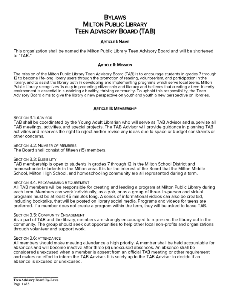 BYLAWS MILTON PUBLIC LIBRARY TEEN ADVISORY BOARD (TAB) ARTICLE I: NAME This organization shall be named the Milton Public Library Teen Advisory Board and will be shortened to TAB. ARTICLE II: MISSION