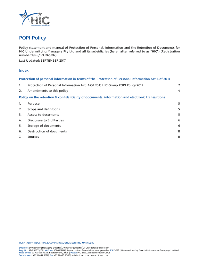 Get the free PROTECTION OF PERSONAL INFORMATION MANUAL & ... - hicsa co
