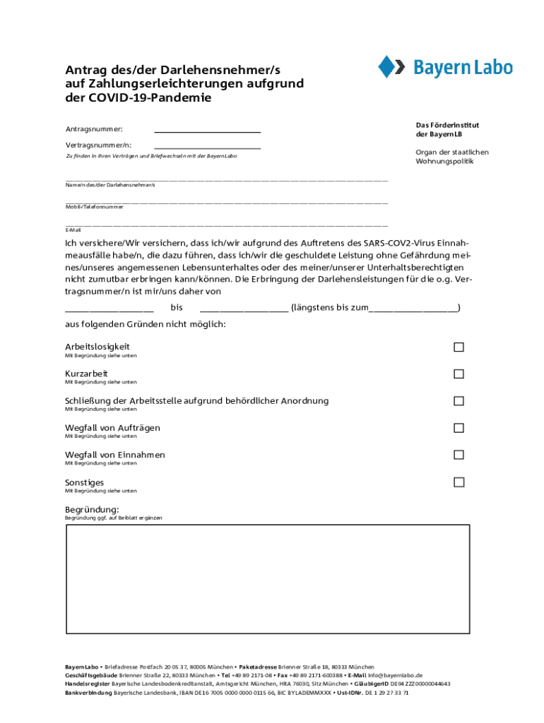 Ant rag DES/her Darlehensnehmer/s AUF Zahlungserleichterungen aground her COVID19Pandemie Was Frderinstitut her BayernLBAntragsnummer: Vertragsnummer/n: EU finder in Then Bergen UND Briefwechseln