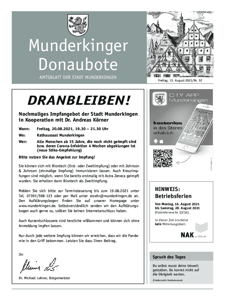 AMTSBLATT HER START MUNDERKINGENFreitag, 13. August 2021/NR. 32DRANBLEIBEN!