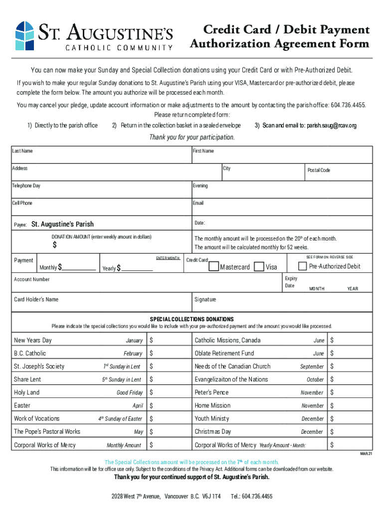 Credit Card / Debit Payment Authorization Agreement Form You can now make your Sunday and Special Collection donations using your Credit Card or with PreAuthorized Debit. If you wish to make your