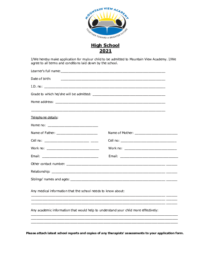 High School 2021 I/We hereby make application for my/our child to be admitted to Mountain View Academy. I/We agree to all terms and conditions laid down by the school. Learners full name: ___ Date