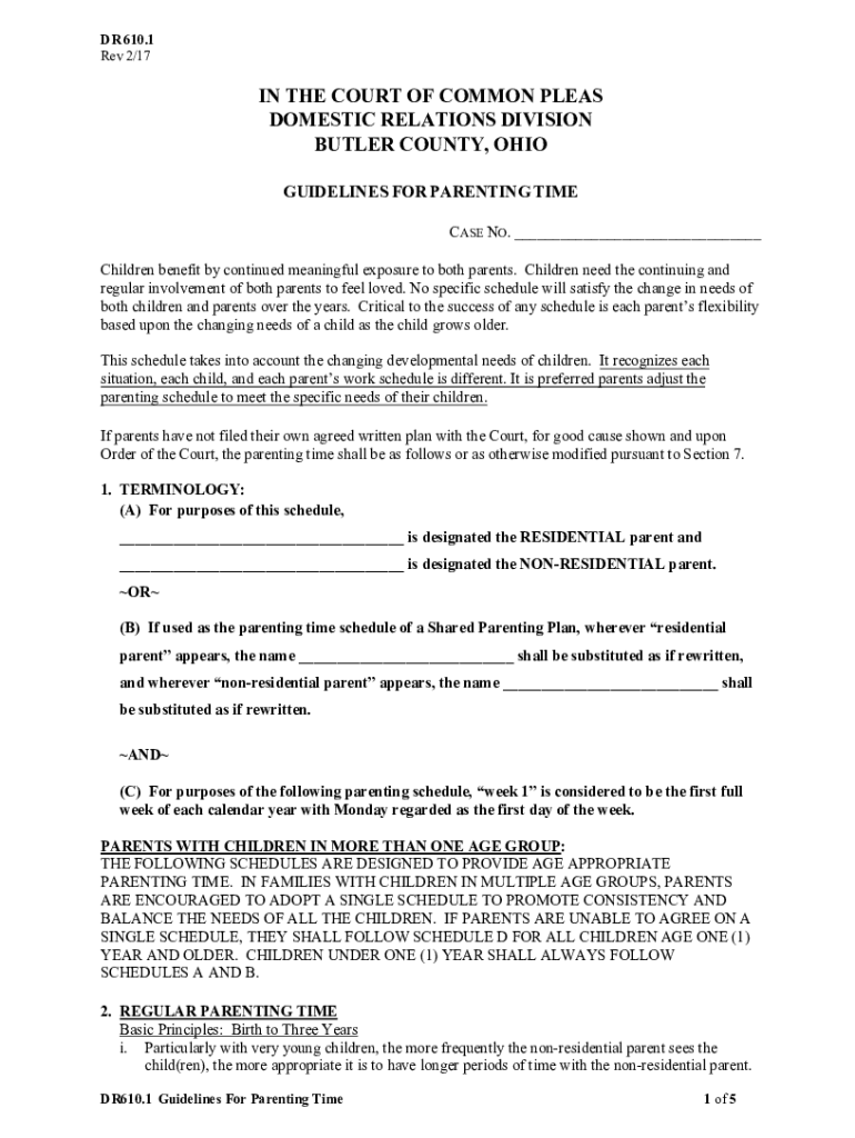 DR 610.1 Rev 2/17IN THE COURT OF COMMON PLEAS DOMESTIC RELATIONS DIVISION BUTLER COUNTY, OHIO GUIDELINES FOR PARENTING TIME CASE NO. ___ Children benefit by continued meaningful exposure to both parents.