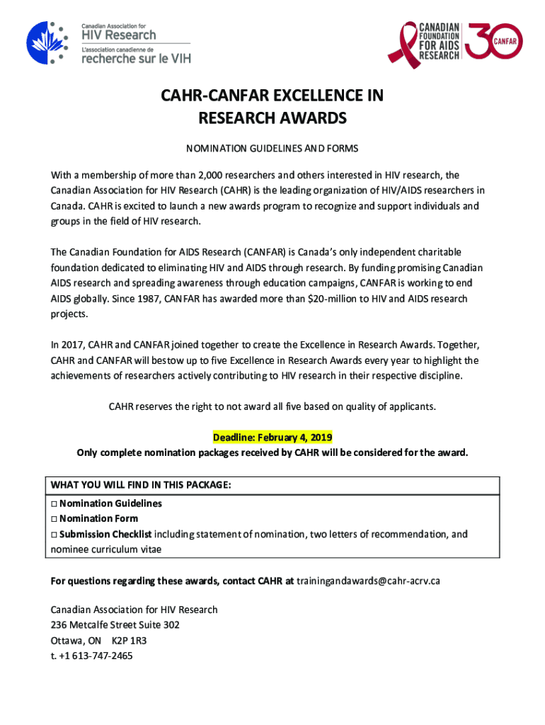 CAHRCANFAR EXCELLENCE IN RESEARCH AWARDS NOMINATION GUIDELINES AND FORMS With a membership of more than 2,000 researchers and others interested in HIV research, the Canadian Association for HIV Research