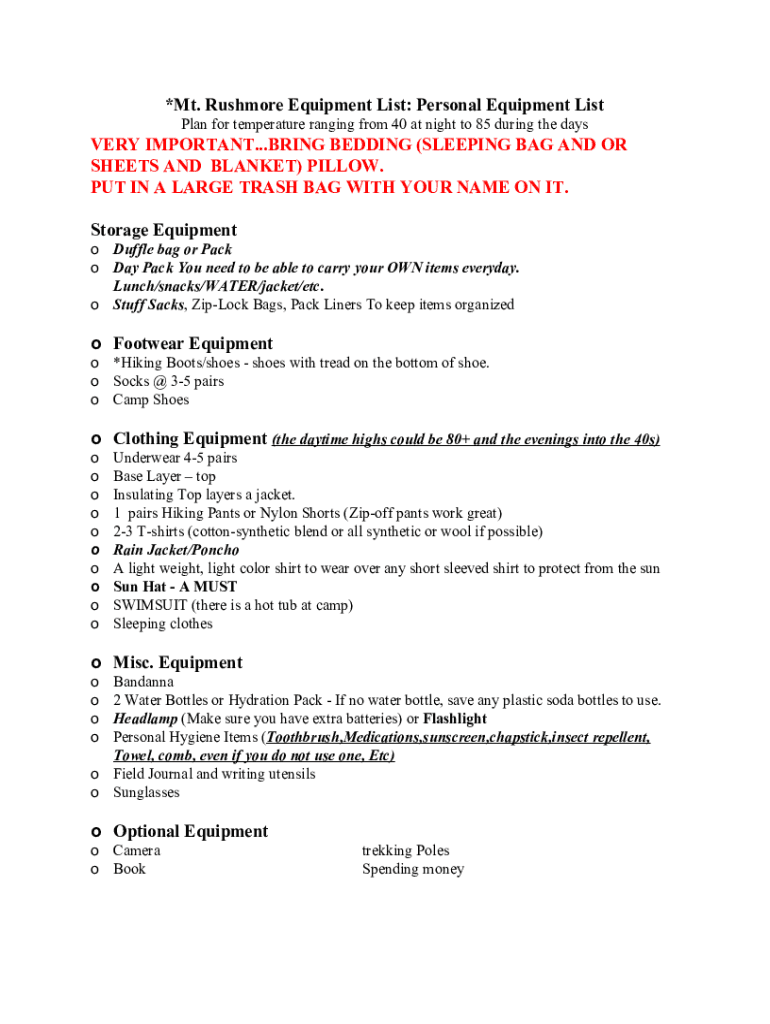 *Mt. Rushmore Equipment List: Personal Equipment List Plan for temperature ranging from 40 at night to 85 during the delivery IMPORTANT...BRING BEDDING (SLEEPING BAG AND OR SHEETS AND BLANKET) PILLOW.
