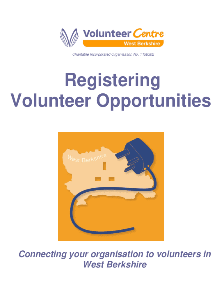 Charitable Incorporated Organization No. 1156302Registering Volunteer OpportunitiesConnecting your organization to volunteers in West BerkshireInformation on Registering Opportunities Why Register?