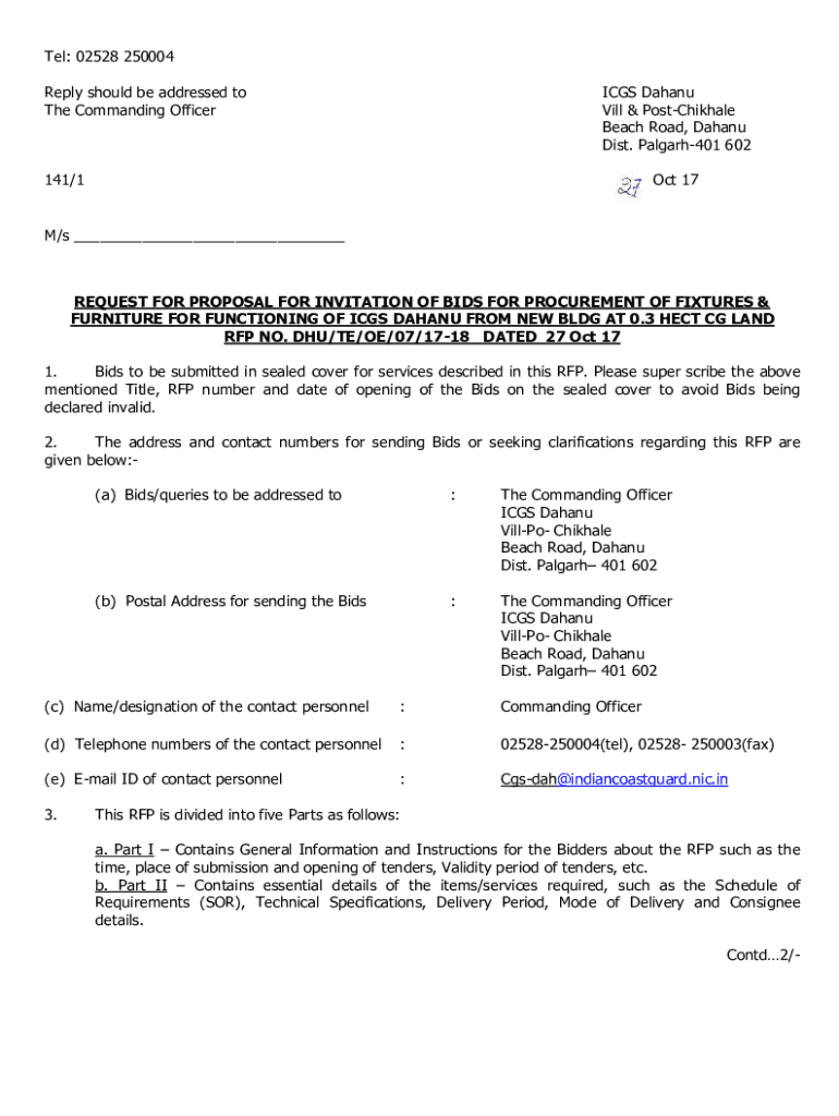 Tel: 02528 250004 Replies should be addressed to The Commanding Officers Dachau Will & PostChikhale Beach Road, Dachau Dist. Palgarh401 602141/1Oct 17M/s ___REQUEST FOR PROPOSAL FOR INVITATION OF