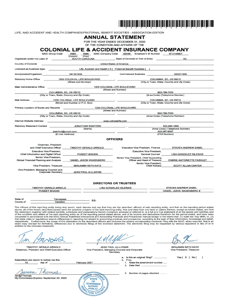 ANNUAL STATEMENT FOR THE YEAR 2020 OF THE COLONIAL LIFE & ACCIDENT INSURANCE COMPANYASSETS 1. Bonds (Schedule D)2. Stocks (Schedule D):3.1Current Year 2AssetsNonadmitted Assets2,870,345,6783 Net Admitted