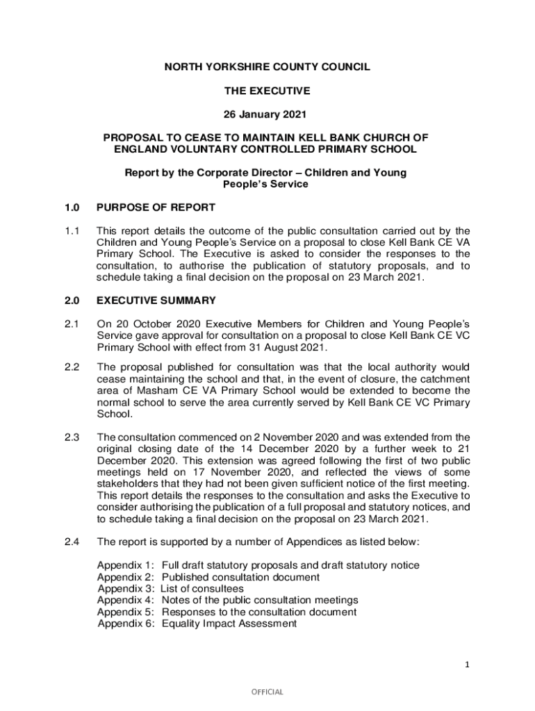 NORTH YORKSHIRE COUNTY COUNCIL THE EXECUTIVE 26 January 2021 PROPOSAL TO CEASE TO MAINTAIN WELL BANK CHURCH OF ENGLAND VOLUNTARY CONTROLLED PRIMARY SCHOOL Report by the Corporate Director Children