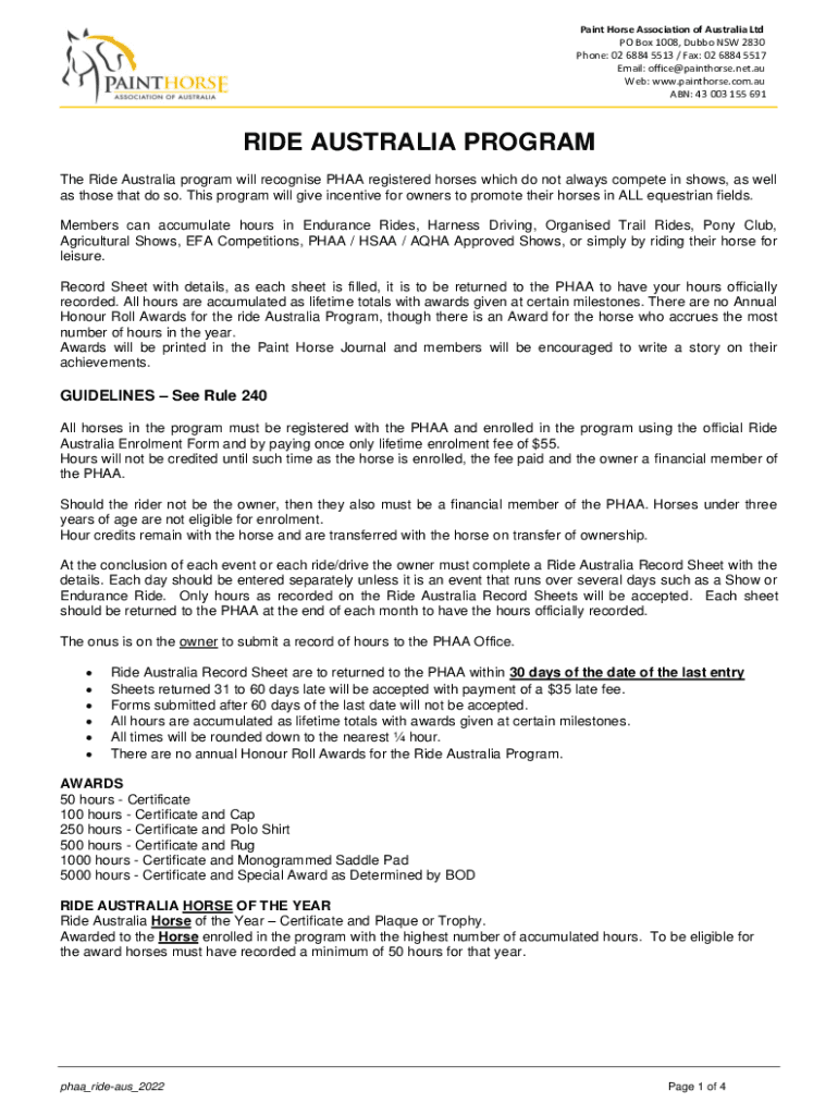 Paint Horse Association of Australia Ltd PO Box 1008, Dumbo NSW 2830 Phone: 02 6884 5513 / Fax: 02 6884 5517 Email: office@painthorse.net.au Web: www.painthorse.com.au ABN: 43 003 155 691RIDE AUSTRALIA
