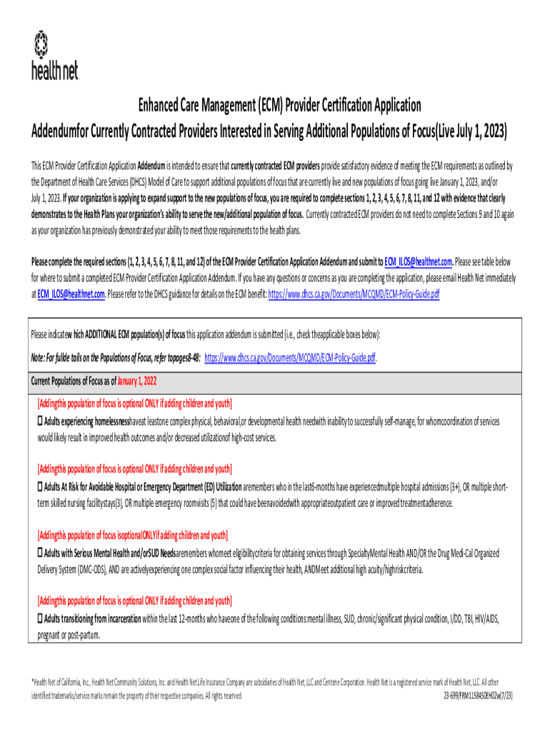 Enhanced Care Management (ECM) Provider Certification Application Addendum for Currently Contracted Providers Interested in Serving Additional Populations of Focus (Live July 1, 2023) This ECM Provider