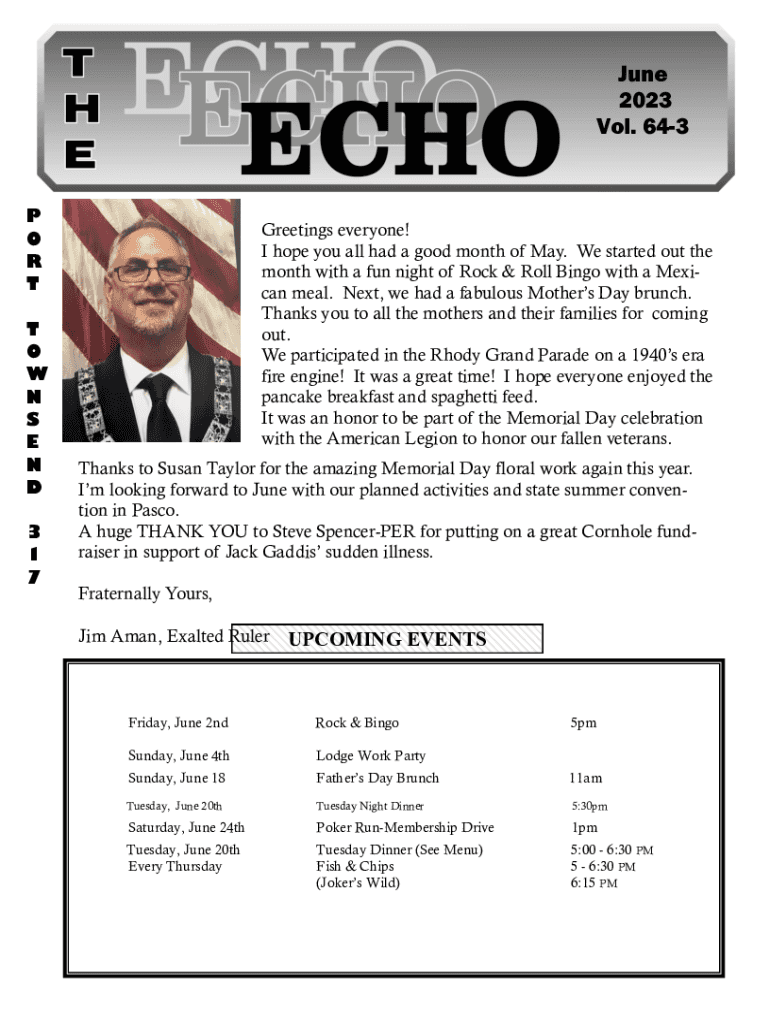 June 2023 Vol. 643P O R T T O W N S E N D3 1 7Greetings everyone! I hope you all had a good month of May. We started out the month with a fun night of Rock & Roll Bingo with a Mexican meal. Next,