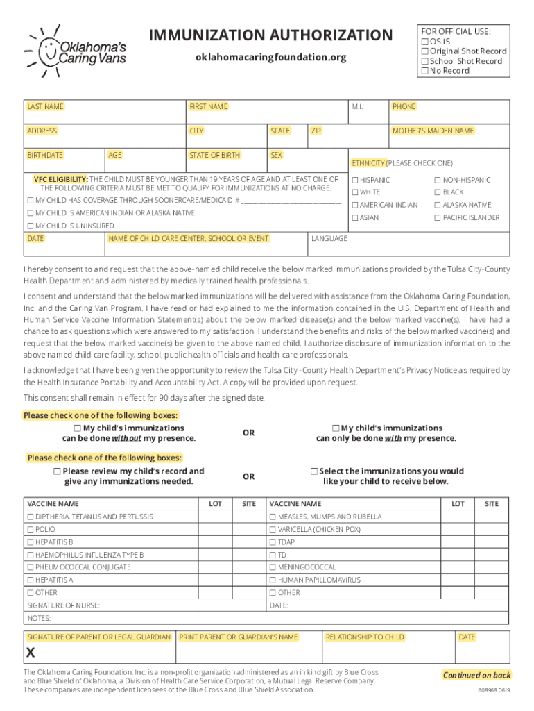 IMMUNIZATION AUTHORIZATION oklahomacaringfoundation. Outlast NAMEFIRST NAMEADDRESSCITYSTATESTATE OF BIRTHSEXBIRTHDATEAGEM. I. ETHNICITY (PLEASE CHECK ONE) MY CHILD HAS COVERAGE THROUGH SOONER CARE/MEDICAID
