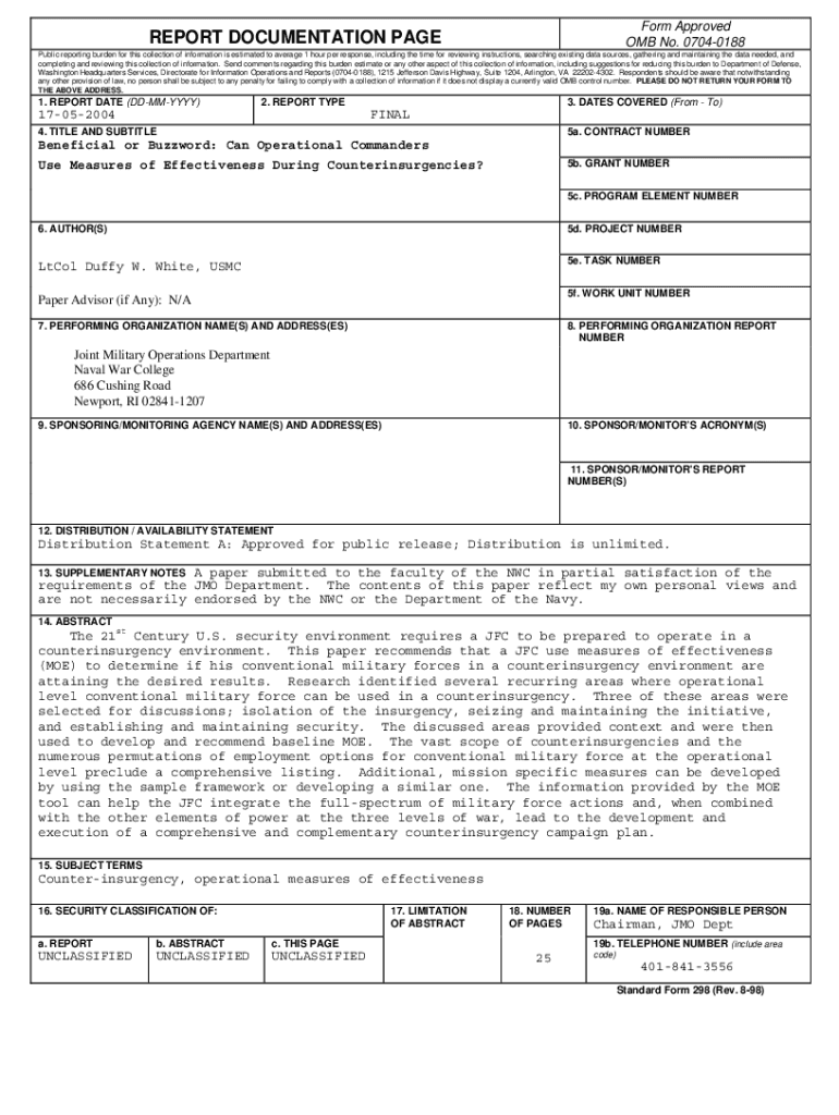 Form Approved OMB No. 07040188REPORT DOCUMENTATION Republic reporting burden for this collection of information is estimated to average 1 hour per response, including the time for reviewing instructions,
