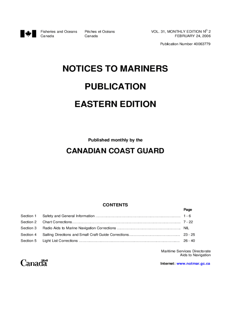Fisheries and Oceans CanadaPches et Cans Canada. 31, MONTHLY EDITION NO 2 FEBRUARY 24, 2006, Publication Number 40063779NOTICES TO MARINERS PUBLICATION EASTERN EDITIONPublished monthly by Canadian