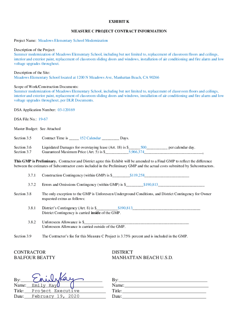 EXHIBIT K MEASURE C PROJECT CONTRACT INFORMATION Project Name: Meadows Elementary School Modernization Description of the Project: Summer modernization of Meadows Elementary School, including but