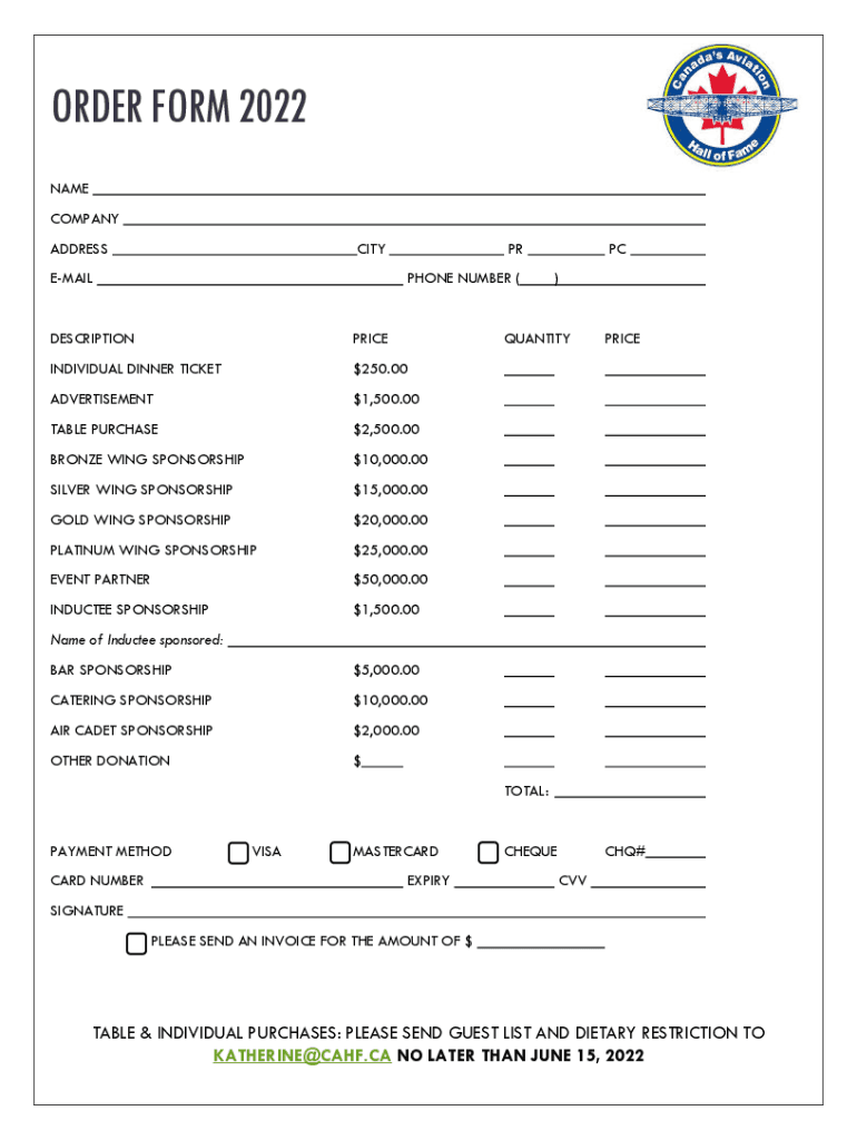 ORDER FORM 2022 NAME COMPANY ADDRESSCITYEMAILPR PHONE NUMBER (DESCRIPTIONPRICEINDIVIDUAL DINNER TICKET$250.00ADVERTISEMENT$1,500.00TABLE PURCHASE$2,500.00BRONZE WING SPONSORSHIP$10,000.00SILVER WING