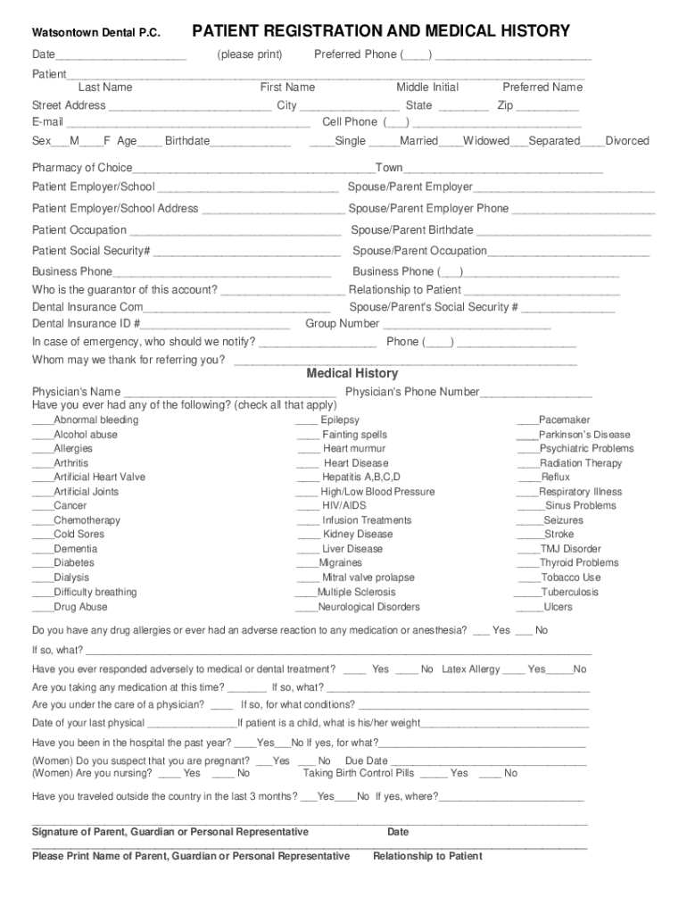 Watson town Dental P.C. Date___PATIENT REGISTRATION AND MEDICAL HISTORY (please print)Preferred Phone (___) ___Patient___ Last Name First Name Middle Initial Preferred Name Street Address ___ City