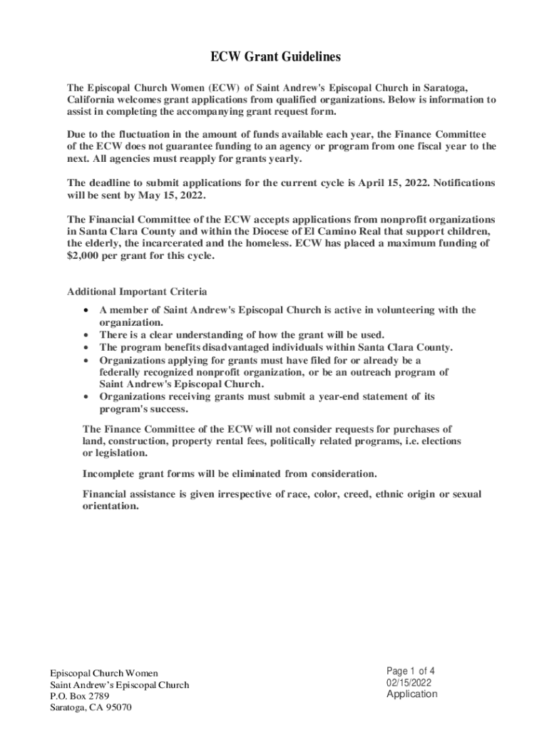 ECW Grant Guidelines The Episcopal Church Women (ECW) of Saint Andrew\'s Episcopal Church in Saratoga, California welcomes grant applications from qualified organizations. Below is information to