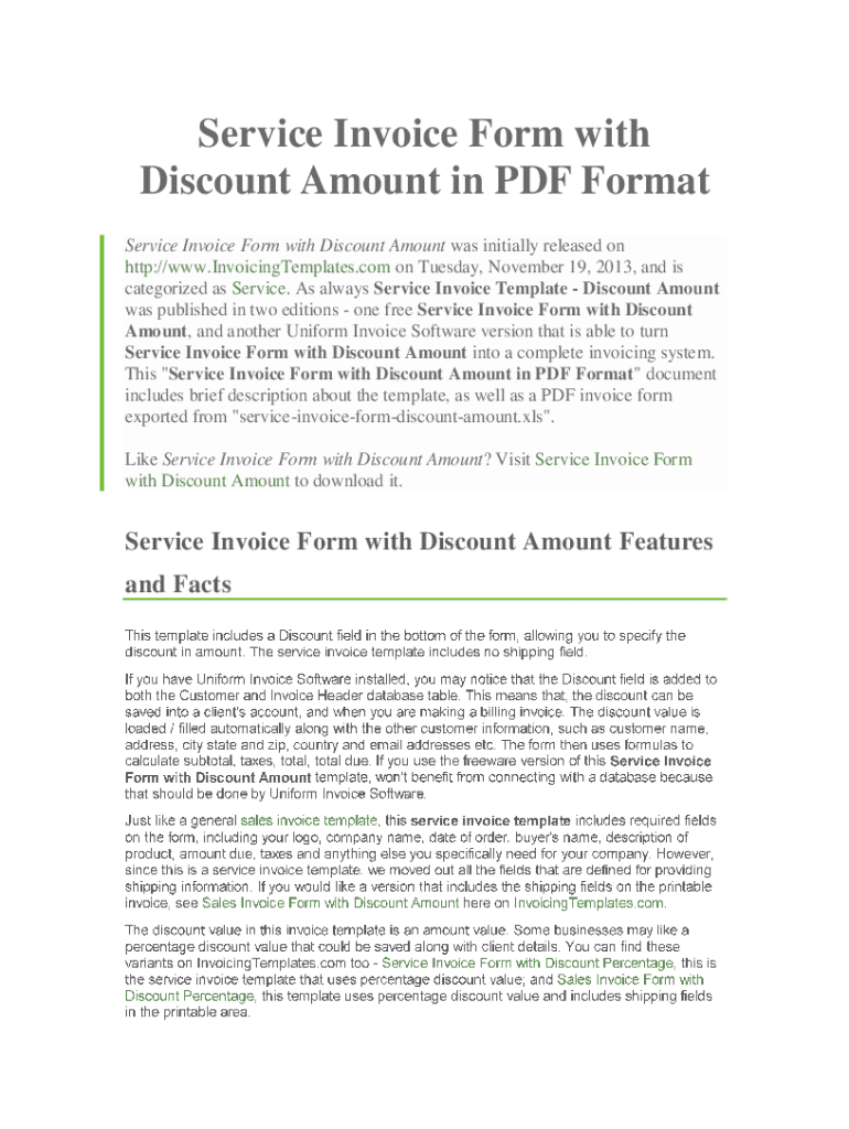 Service Invoice Form with Discount Amount in PDF Format Service Invoice Form with Discount Amount was initially released on http://www.InvoicingTemplates.com on Tuesday, November 19, 2013, and is