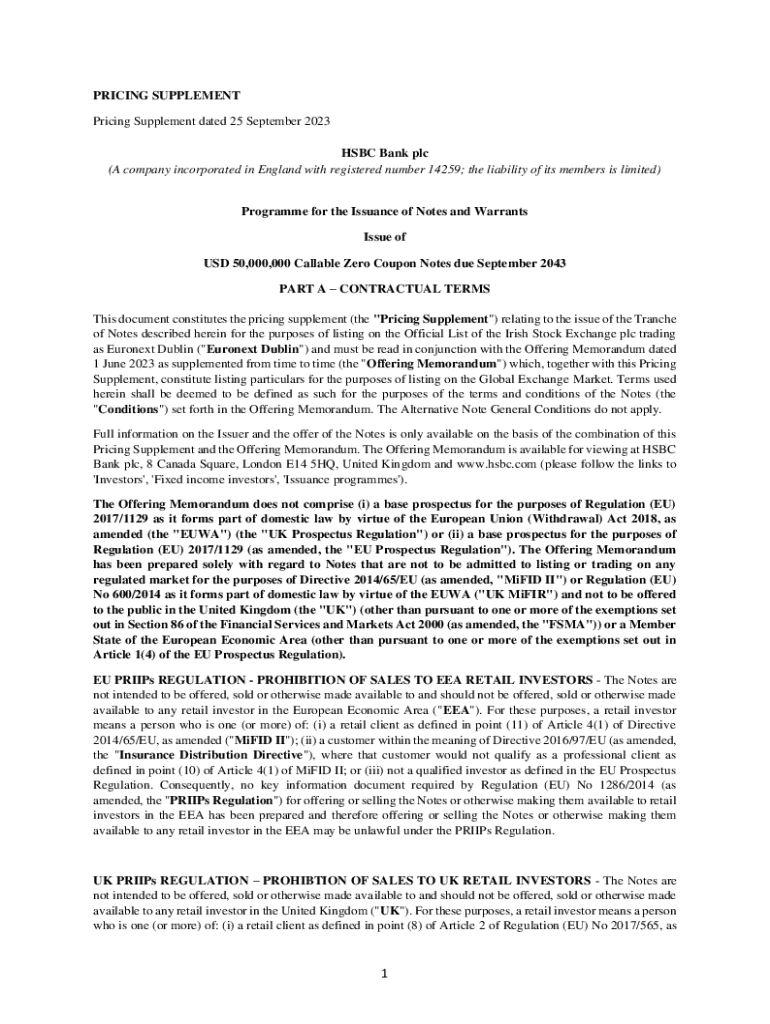 PRICING SUPPLEMENT dated 25 September 2023 HSBC Bank plc (A company incorporated in England with registered number 14259; the liability of its members is limited)Program for the Issuance of Notes