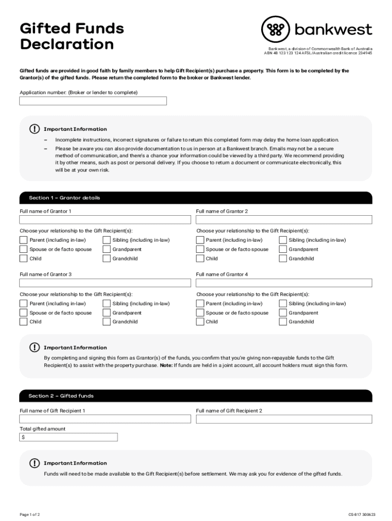 Gifted Funds DeclarationBankwest, a division of Commonwealth Bank of Australia ABN 48 123 123 124 ADSL/Australian credit license 234945Gifted funds are provided in good faith by family members to