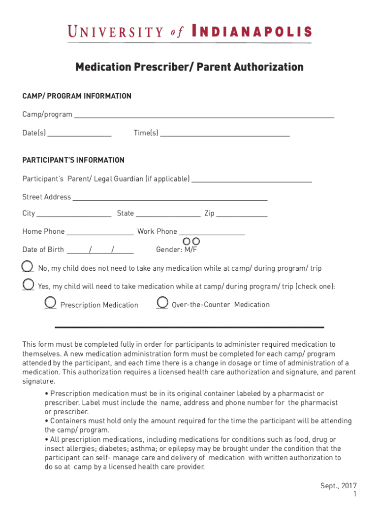 Medication Prescriber/ Parent Authorization CAMP/ PROGRAM INFORMATION Camp/program Date(s)Time(s)PARTICIPANTS INFORMATION Participants Parent/ Legal Guardian (if applicable) Street Address CityStateHome