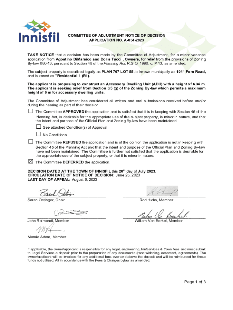 COMMITTEE OF ADJUSTMENT NOTICE OF DECISION APPLICATION NO. A0342023TAKE NOTICE that a decision has been made by the Committee of Adjustment, for a minor variance application from Agostinho DiMaggio