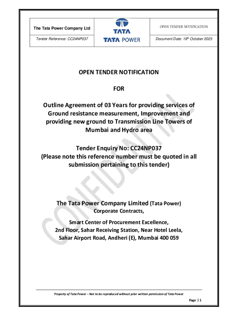 The Tata Power Company Open TENDER NOTIFICATIONTender Reference: CC24NP037Document Date: 19th October 2023OPEN TENDER NOTIFICATION FOR Outline Agreement of 03 Years for providing services of Ground
