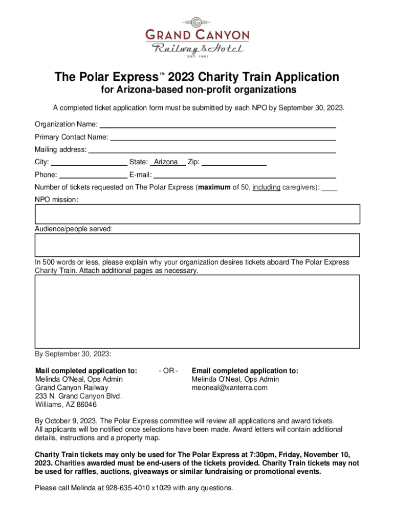 The Polar Express 2023 Charity Train Application for Arizona based nonprofit organizations A completed ticket application form must be submitted by each NPO by September 30, 2023. Organization Name: