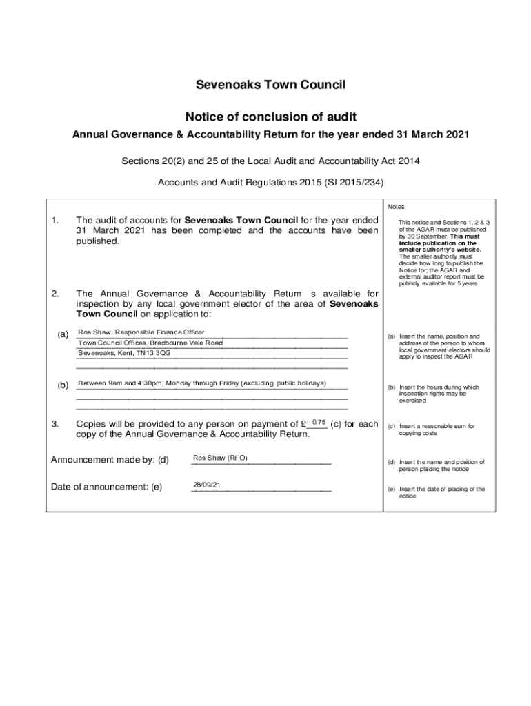Seven oaks Town Council Notice of conclusion of audit Annual Governance & Accountability Return for the year ended 31 March 2021 Sections 20(2) and 25 of the Local Audit and Accountability Act 2014