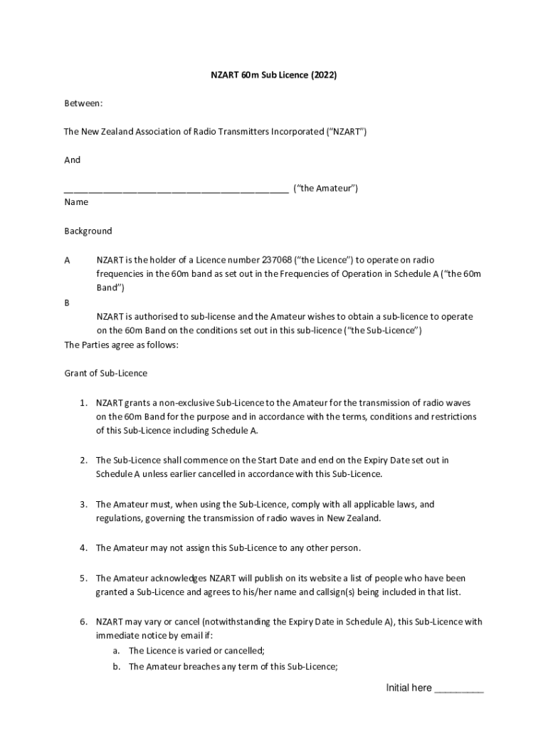 NZ ART 60 m Sub License (2022) Between: The New Zealand Association of Radio Transmitters Incorporated (NZ ART) And ___ (the Amateur) Name Background ANZ ART is the holder of a License number 237068