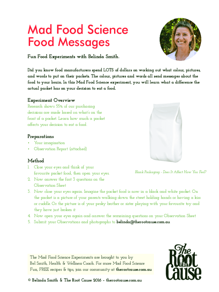 Mad Food Science Food Messages Fun Food Experiments with Belinda Smith. Did you know food manufacturers spend LOTS of dollars on working out what color, pictures, and words to put on their packets?