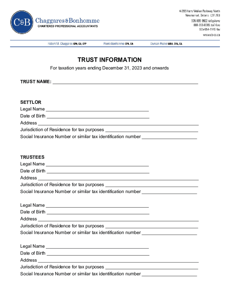 TRUST INFORMATION For taxation years ending December 31, 2023, and onwards TRUST NAME: ___SETTLER Legal Name ___ Date of Birth ___ Address ___ Jurisdiction of Residence for tax purposes ___ Social