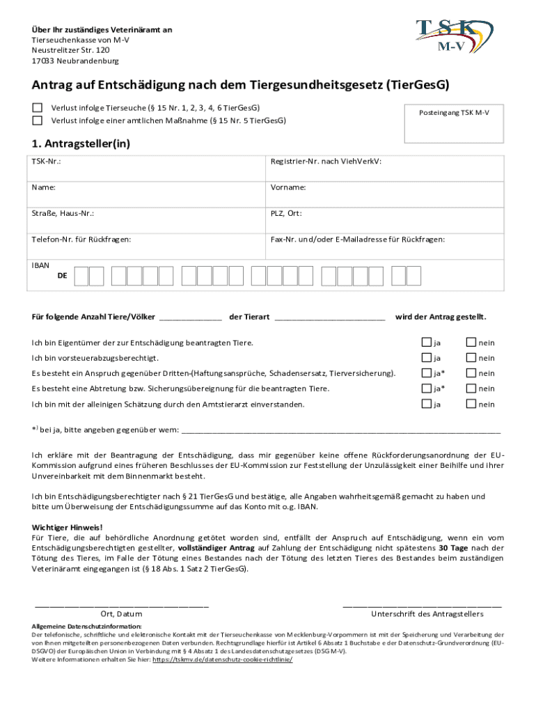 BER ICR zustndiges Veterinary a Tierseuchenkasse von MV Neutralizer STR. 120 17033 NeubrandenburgAntrag AUF Entschdigung each them Tiergesundheitsgesetz (Teargas) Versus involve Tierseuche (15 NR.