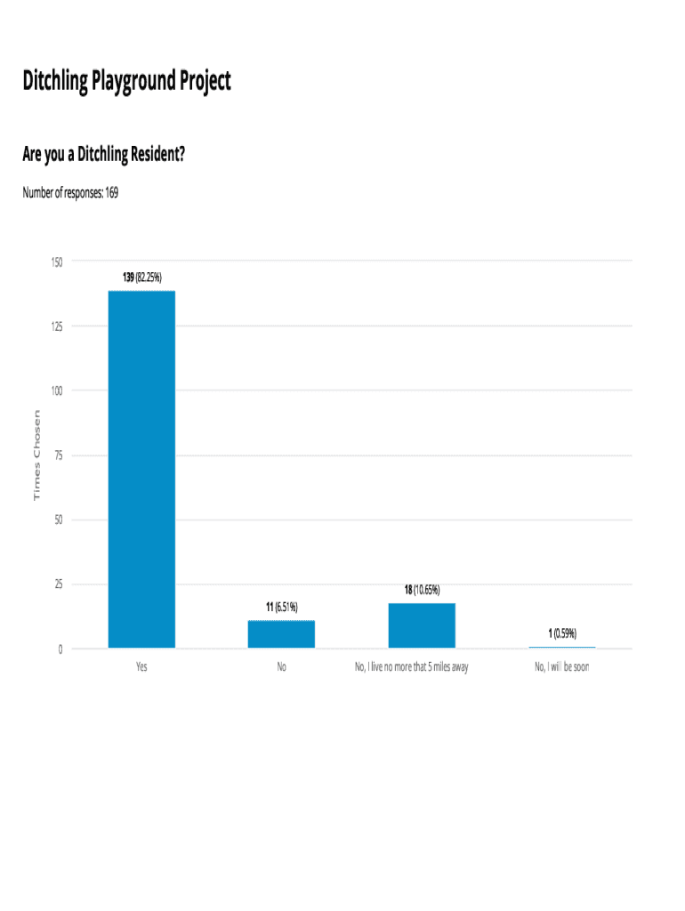Ditching Playground Project Are you a Ditching Resident? Number of responses: 169150139 (82.25%)125100nesoh C semiT755025 11 (6.51%) 018 (10.65%) 1 (0.59%)Lesson, I live no more than 5 miles away