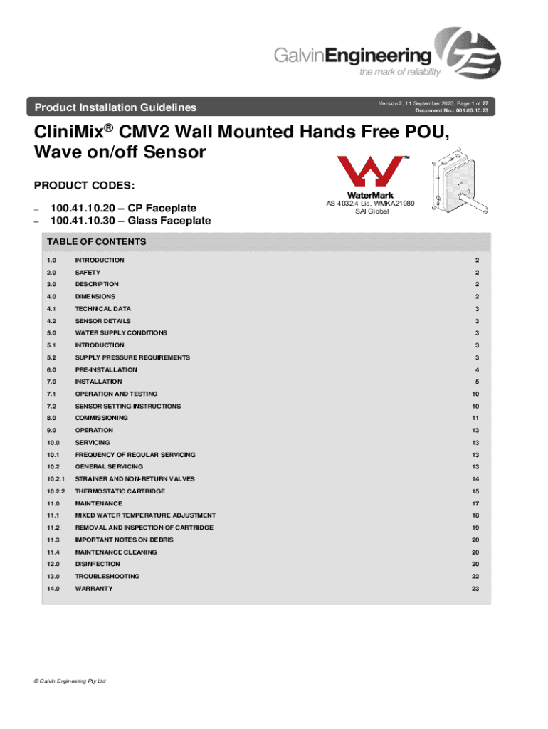 Product Installation GuidelinesVersion 2, 11 September 2023, Page 1 of 27 Document No.: 001.00.10.23CliniMix CMV2 Wall Mounted Hands Free POU, Wave on/off Sensor PRODUCT CODES: 100.41.10.20 CP Face