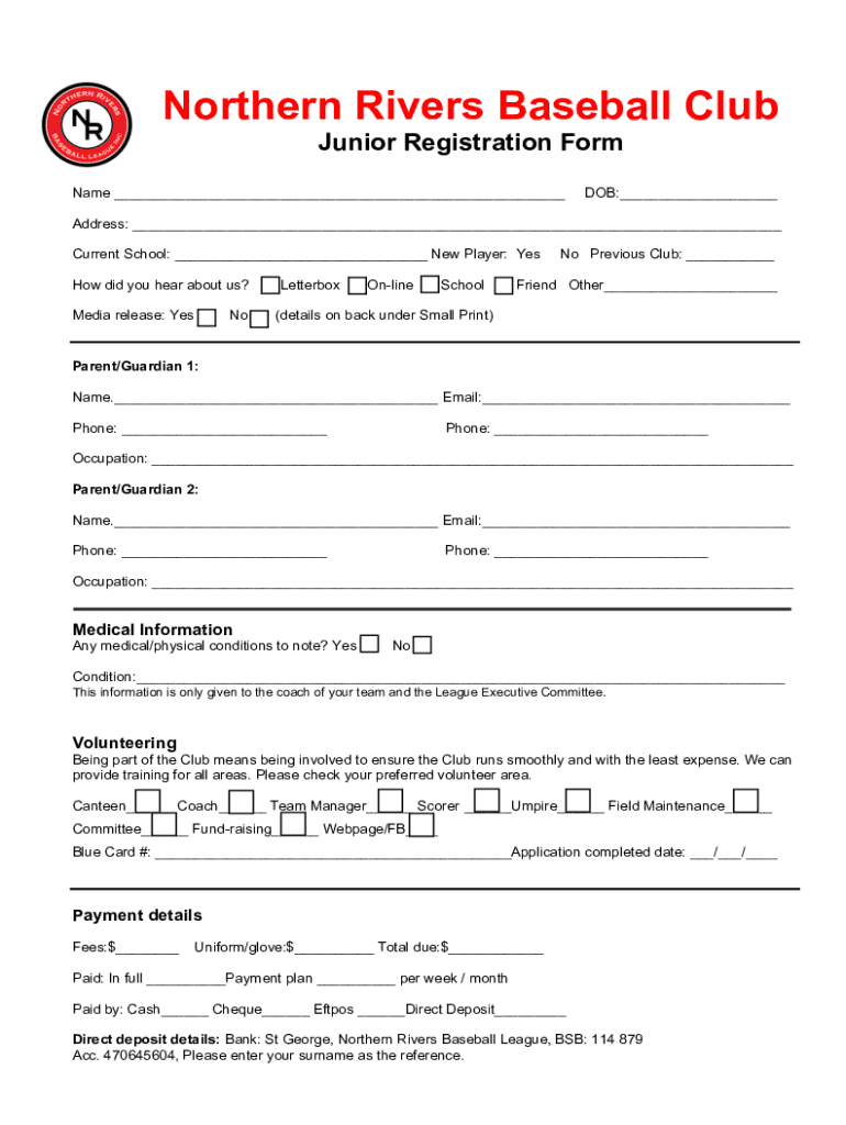 Northern Rivers Baseball Club Junior Registration Form Name ___DOB:___Address: ___ Current School: ___ New Player: Yes How did you hear about us? Media release: YesNoLetterboxOnlineSchoolNo Previous