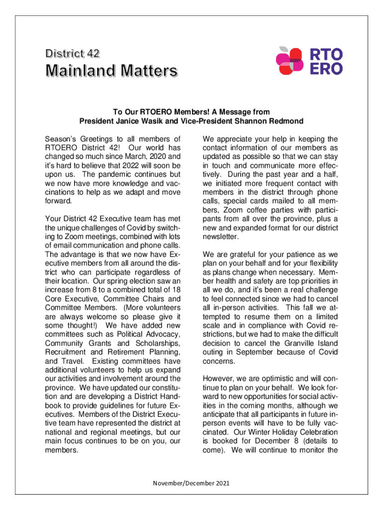 To Our RTO ERO Members! A Message from President Janice Was and VicePresident Shannon Redmond Season's Greetings to all members of RTO ERO District 42! Our world has changed so much since March 2020,
