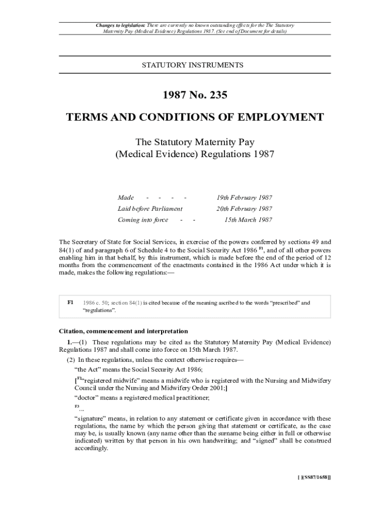 Changes to legislation: There are currently no known outstanding effects for the Statutory Maternity Pay (Medical Evidence) Regulations 1987. (See end of Document for details)STATUTORY INSTRUMENTS1987