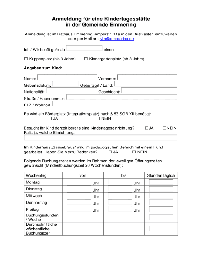 Die Anmeldung für eine Kindertagesstätte sollte vollständig und genau ausgefüllt werden, wobei persönliche Informationen über das Kind, die Eltern und möglicherweise besondere Bedürfnisse des Kindes angegeben werden müssen.
