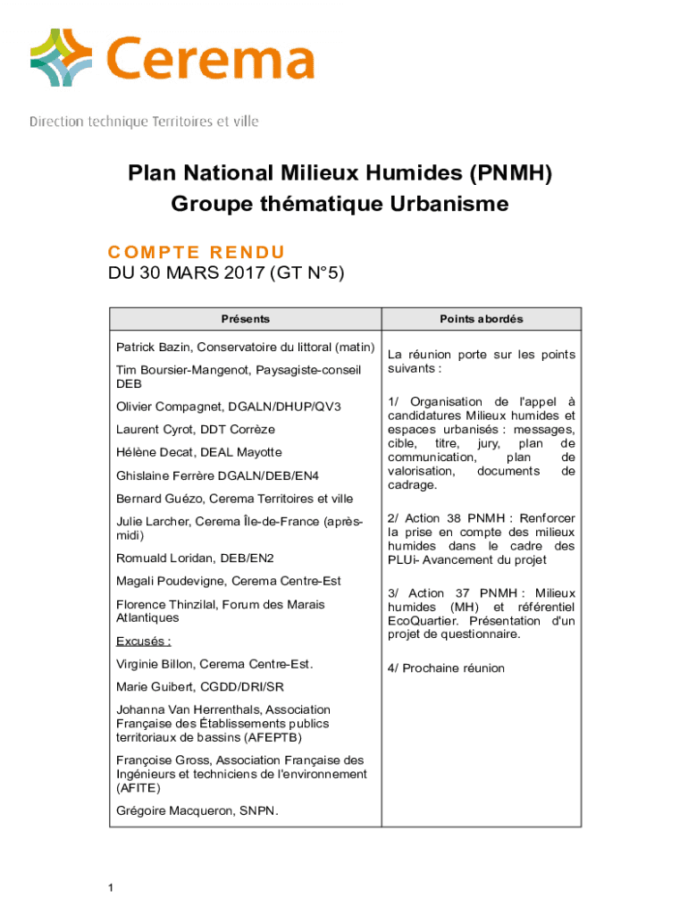 Plan National Milieux Hum ides (PNM) Group thematize Urbanism COMPETE REND DU 30 MARS 2017 (GT N5) PrsentsPatrick Basin, Conservatoire Du littoral (main) Tim BoursierMangenot, Paysagisteconseil DEB