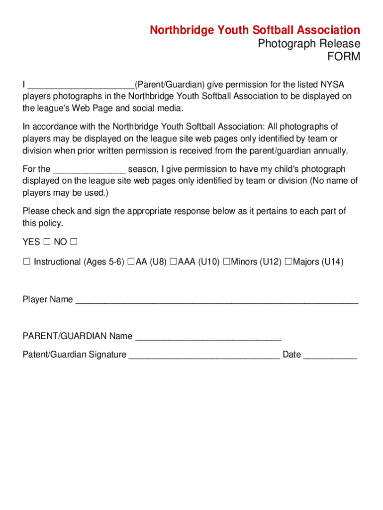 North bridge Youth Softball Association Photograph Release FORM I ___(Parent/Guardian) give permission for the listed NASA players photographs in the North bridge Youth Softball Association to be