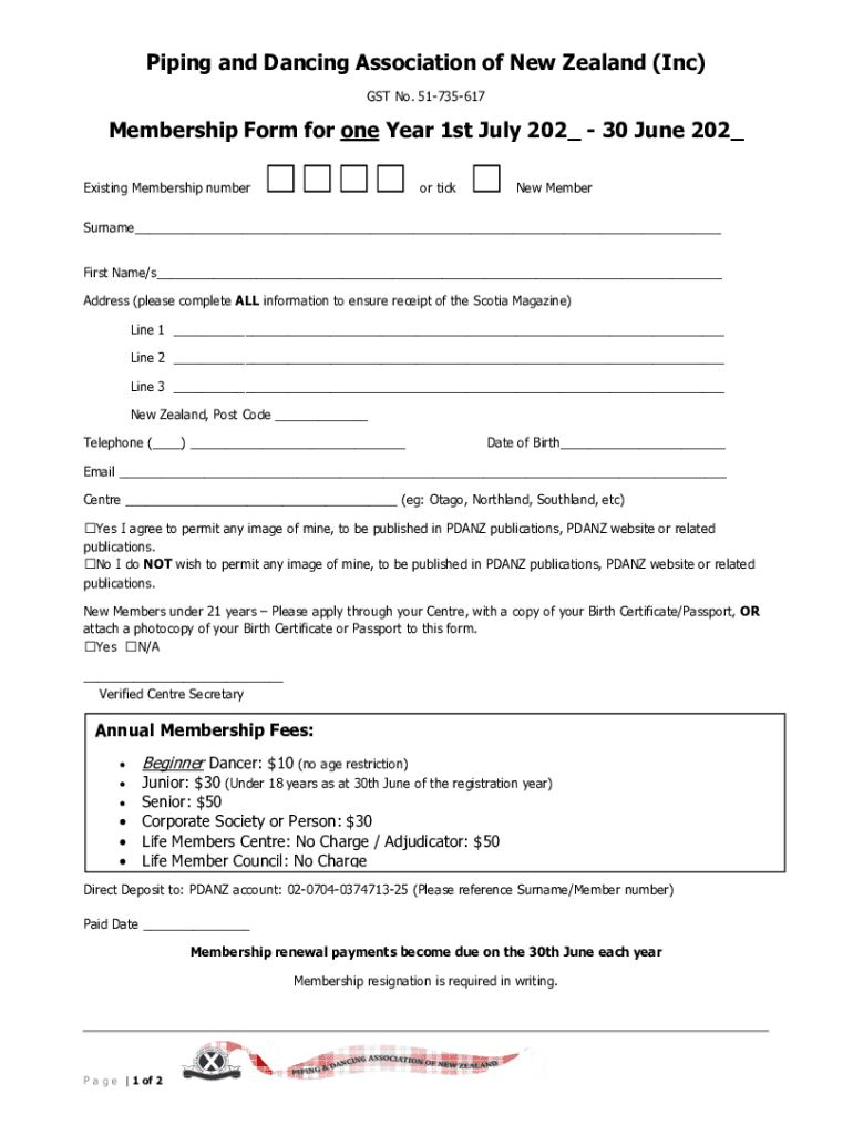 Piping and Dancing Association of New Zealand (Inc) GST No. 51735617Membership Form for one Year 1st July 202_ 30 June 202_ Existing Membership number or ticket MemberSurname___ First Name/s___ Address