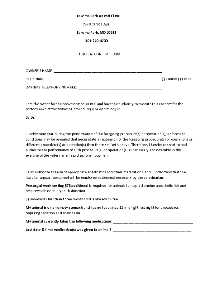 Tacoma Park Animal Clinic 7330 Carroll Ave Tacoma Park, MD 20912 3012704700 SURGICAL CONSENT FOLLOWERS NAME: ___ PETS NAME: ___ () Canine () Feline DAYTIME TELEPHONE NUMBER: ___I am the owner for