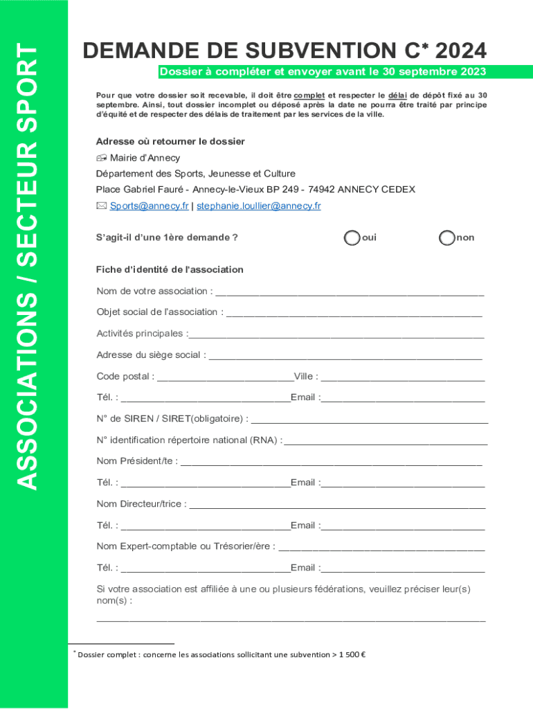 ASSOCIATIONS / SECT EUR SPORTDEMANDE DE SUBVENTION C 2024 Dossier computer ET envoy her savant LE 30 September 2023Pour Que vote dossier soil receivable, IL dot TRE complete ET respecter LE DLA de